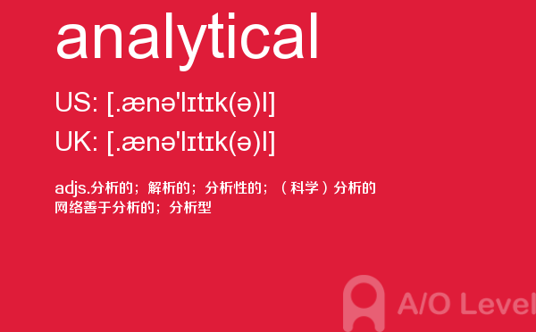 a-level课程证书被几乎所有英语授课的大学作为招收新生的入学标准。 在中国开设a-level课程旨在为中国学生提供进入国外大学的有效途径,具体目标为:培养在国内初高中成绩优秀的学生进入世界顶尖大学;培养在国内初高中成绩中等的学生进入世界一流大学;培养在国内初高中成绩一般的学生考取适合自己的大学。今天alevel考试网小编给大家详细解析a-level考试单词analytical。如果您想了解alevel化学专业英语,alevel机经下载,查询alevel考试报名信息2018,英国alevel考试时间等关于a-level考试的相关资讯,请继续浏览并关注课窝a/o-level考试网。