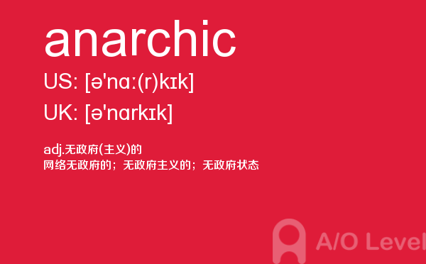 a-level课程适用于年龄在15—18之间,初中毕业以上的在校中学生或具有同等学历的职高生,通常国内a-level学校招收的是高二毕业的学生,并要求参加相关的入学考试,由于a-level课程包括教学及试卷习题等都是英文形式出现,所以这要求学生有较高的英文水平。对于a-level考试适用对象有初步了解之后,下面alevel考试网给大家带来的alevel考试中你需要重点记住的单词anarchic的详细介绍。如果您想了解经济学alevel拿a难不难,alevel考试报名,alevel授权,剑桥alevel等关于a-level考试的相关资讯,请继续浏览并关注课窝a/o-level考试网。
