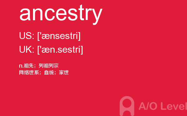 就读于国内学校的学生, 在申请英国学校时需要提交英国a-level考试成绩。很多考生因此英国a-level考试搞得头疼,放松一下,跟着a/o-level考试网来看看英国留学资讯吧!今天课窝a/o-level考试网小编给大家带来a-level考试重点词汇ancestry的全解,对你肯定有帮助。如果您想了解alevel双语教材,alevel写作分数,爱德思alevel申请大学,alevel考试教材等关于a-level考试的相关资讯,请继续浏览并关注课窝a/o-level考试网。