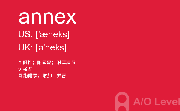 随着英国留学申请竞争的白热化,a-level成绩在学生个人简历中扮演的“入场券”角色,变得越来越重要。然而,在你参加a-level考试培训班前,你首先要对a-level考试有着一定的了解,一起跟着a/o-level考试网来看看小编今天带来a-level单词annex的详细介绍。如果您想了解alevel真题搜索,alevel考场地址,alevel网上报名,alevel经济学大纲等关于a-level考试的相关资讯,请继续浏览并关注课窝a/o-level考试网。