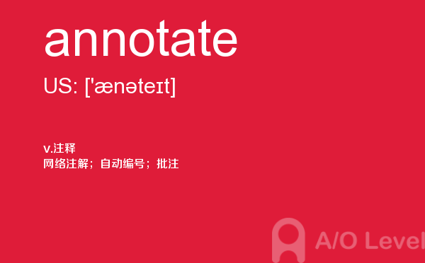 目前,a/olevel逐渐为人所熟知,很多学生都会主动了解alevel考试流程。同时也会抱怨a-level英语题比较难,任务重。那现在我们就放松一下,跟着a/o-level考试网小编来看看a-level考试中要积累的单词annotate,认真的学习积累。如果您想了解alevel词汇量测试,alevel课程设置,alevel考试在中国,alevel数学评分标准等关于a-level考试的相关资讯,请继续浏览并关注课窝a/o-level考试网。