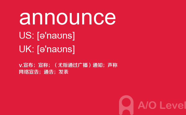 英国a-level考试是英国留学生去英国留学需要参加的考试,很多考生担心a-level考试分数要求高,英国a-level考试难度大,别担心,只要认真的学习a-level考试内容,小编相信大家一定能够考得a-level高分。今天a/o-level考试网给大家带来单词announce的全面解析。如果您想了解alevel经济教材,alevel中文书目,alevel中文口语,a水准考试预备班怎么样等关于a-level考试的相关资讯,请继续浏览并关注课窝a/o-level考试网。