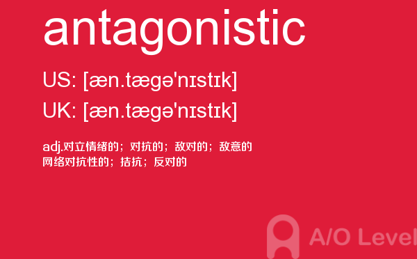 英国a-level学校,从教学质量上来看私立学校更占优势,大部分中国留学生也选择私立学校来读,不过一般都是提前一年来申请学校。中国目前也有20几所a-level学校,每年也同样有走进剑桥牛津等世界顶级大学的学生。所以在国外和在国内都可以选择a-level学校来学习。在前面关于a-level选校的问题已经详细介绍过,那么今天a/o-level考试网小编主要想介绍的是a-level重难点词汇antagonistic。希望对大家有帮助。如果您想了解alevel官方报名,alevel美术课程,alevel数学难度,alevel高数等关于a-level考试的相关资讯,请继续浏览并关注课窝a/o-level考试网。