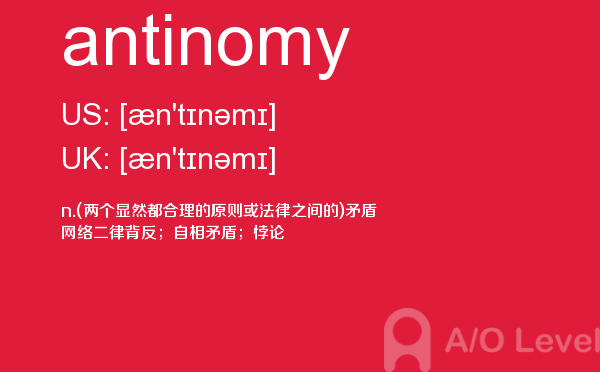 a-level课程证书被几乎所有英语授课的大学作为招收新生的入学标准。 在中国开设a-level课程旨在为中国学生提供进入国外大学的有效途径,具体目标为:培养在国内初高中成绩优秀的学生进入世界顶尖大学;培养在国内初高中成绩中等的学生进入世界一流大学;培养在国内初高中成绩一般的学生考取适合自己的大学。今天alevel考试网小编给大家详细解析a-level考试单词antinomy。如果您想了解alevel物理知识点,a水准物理专业术语,a水准考试试题,中国alevel考试等关于a-level考试的相关资讯,请继续浏览并关注课窝a/o-level考试网。
