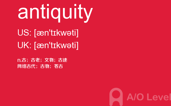 英国a-level学校,从教学质量上来看私立学校更占优势,大部分中国留学生也选择私立学校来读,不过一般都是提前一年来申请学校。中国目前也有20几所a-level学校,每年也同样有走进剑桥牛津等世界顶级大学的学生。所以在国外和在国内都可以选择a-level学校来学习。在前面关于a-level选校的问题已经详细介绍过,那么今天a/o-level考试网小编主要想介绍的是a-level重难点词汇antiquity。希望对大家有帮助。如果您想了解上海alevel培训机构,alevel数学公式表,alevel成绩查询时间,alevel申请新加坡等关于a-level考试的相关资讯,请继续浏览并关注课窝a/o-level考试网。
