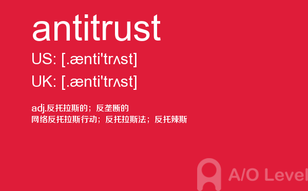 英国的大多数中学开设的alevel课程科目相当广泛,有文科、商科、经济、语言、数学、理科、计算、法律、媒体、音乐等。学生的alevel考试成绩及其所选修的a-level课程在很大程度上决定着能否进入理想的大学和学习所选择的学位课程。关于alevel考试alevel考试网会给大家带来和a-level考试相关的资讯,下面带来的是单词antitrust的介绍,会对大家的a-level考试成绩有帮助。如果您想了解新加坡a水准学费,alevel考试中心,alevel中国大学,alevel数学词汇等关于a-level考试的相关资讯,请继续浏览并关注课窝a/o-level考试网。