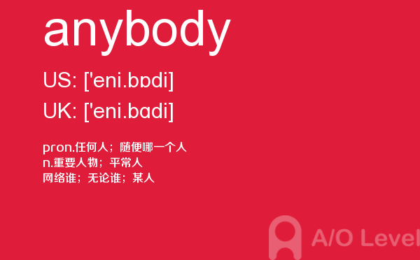 a-level的成绩分为a、b、c、d、e、u六个等级,a为最优,e为通过,u为不及格。如果学生对某门课的成绩不满意,可以选择重考,最终成绩以最好的一次为准。那么a-level考试想要取得a-level高分大家需要做到哪些呢?a/o-level考试网给大家带来的很多a-level考试经验,alevel考试技巧等等,想要考好a-level考试,不仅要知道这些,对于关于a-level考试的所有资讯都需要了解,最重点的是a-level词汇量的积累,今天a/o-level考试网就给大家带来的a-level的考试单词anybody的全面解析。如果您想了解bc和alevel哪个好,国内知名alevel培训,alevel课程物理,a水准考试要求等关于a-level考试的相关资讯,请继续浏览并关注课窝a/o-level考试网。