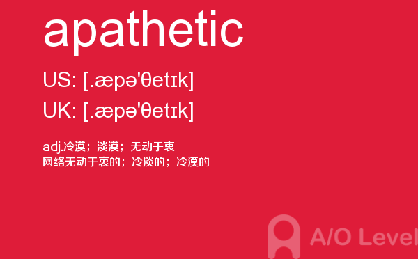 在a-level备考的过程中,想要冲刺到a-level写作的高分,相信大家都应该会知道,除了需要掌握a-level写作的一些技巧之外,优化文章中的词汇和句型也是冲刺高分的关键所在。也就是说,只有充分掌握了语法知识,才能让我们的的文章更为丰富形象。除了a-level写作,在a-level其他方面同学们也需要了解,下面课窝a/o-level考试网小编给大家带来a-level单词apathetic的介绍。如果您想了解alevel网上报名,alevel国际课程介绍,新加坡a水准学费,alevel范文等关于a-level考试的相关资讯,请继续浏览并关注课窝a/o-level考试网。