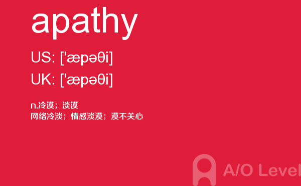 英国a-level考试是英国留学生去英国留学需要参加的考试,很多考生担心a-level考试分数要求高,英国a-level考试难度大,别担心,只要认真的学习a-level考试内容,小编相信大家一定能够考得a-level高分。今天a/o-level考试网给大家带来单词apathy的全面解析。如果您想了解alevel到底是什么课程,alevel考试要求,新加坡a水准好考吗,alevel网课等关于a-level考试的相关资讯,请继续浏览并关注课窝a/o-level考试网。