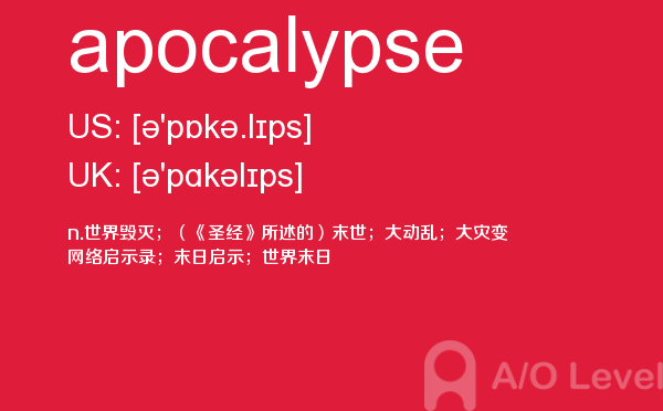 a-level课程证书被几乎所有英语授课的大学作为招收新生的入学标准。 在中国开设a-level课程旨在为中国学生提供进入国外大学的有效途径,具体目标为:培养在国内初高中成绩优秀的学生进入世界顶尖大学;培养在国内初高中成绩中等的学生进入世界一流大学;培养在国内初高中成绩一般的学生考取适合自己的大学。今天alevel考试网小编给大家详细解析a-level考试单词apocalypse。如果您想了解alevel有什么好学校,新加坡a水准好考吗,alevel数学难度,港大alevel申请条件等关于a-level考试的相关资讯,请继续浏览并关注课窝a/o-level考试网。