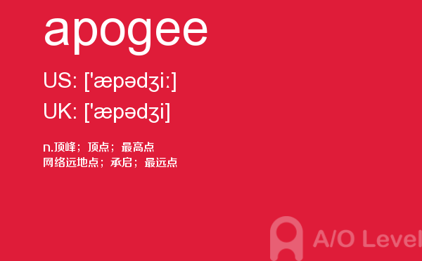 对于a-level考试,我们一再强调要加强a-level考试真题实战,多做英国a-level考试真题。放松一下,跟着a/o-level考试网来积累一下a-level考试中你会用到的单词apogee,对你的a-level考试会有很大的帮助。如果您想了解alevel考试报名费,英国alevel,alevel物理考a难吗,国内学alevel要多少钱等关于a-level考试的相关资讯,请继续浏览并关注课窝a/o-level考试网。