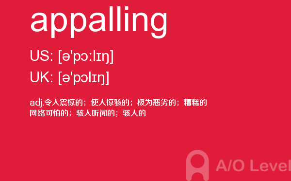 目前,a/olevel逐渐为人所熟知,很多学生都会主动了解alevel考试流程。同时也会抱怨a-level英语题比较难,任务重。那现在我们就放松一下,跟着a/o-level考试网小编来看看a-level考试中要积累的单词appalling,认真的学习积累。如果您想了解alevel词汇量测试,alevel课程设置,alevel考试在中国,alevel数学评分标准等关于a-level考试的相关资讯,请继续浏览并关注课窝a/o-level考试网。