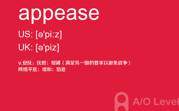 a-level 的考试将由所属的考试委员会分别于每年5-6月和10-11月在全球统一组织,成绩分别在8月和次年2月公布。关于a-level考试时间的具体内容,alevel考试网前面详细介绍过,大家可以查找alevel考试网前面的a-level考试资讯,alevel考试网每天会更新大量的alevel考试资讯,本篇要给大家介绍a-level单词appease的全面介绍。如果您想了解alevel香港中文大学,上海alevel培训班,中国alevel考点,alevel中文书目等关于a-level考试的相关资讯,请继续浏览并关注课窝a/o-level考试网。
