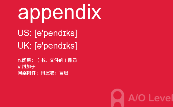 随着英国留学申请竞争的白热化,a-level成绩在学生个人简历中扮演的“入场券”角色,变得越来越重要。然而,在你参加a-level考试培训班前,你首先要对a-level考试有着一定的了解,一起跟着a/o-level考试网来看看小编今天带来a-level单词appendix的详细介绍。如果您想了解了解alevel辅导,alevel机经下载,alevel历年成绩分析,alevel课程的劣势等关于a-level考试的相关资讯,请继续浏览并关注课窝a/o-level考试网。