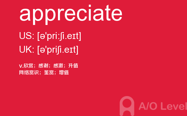 a-level的成绩分为a、b、c、d、e、u六个等级,a为最优,e为通过,u为不及格。如果学生对某门课的成绩不满意,可以选择重考,最终成绩以最好的一次为准。那么a-level考试想要取得a-level高分大家需要做到哪些呢?a/o-level考试网给大家带来的很多a-level考试经验,alevel考试技巧等等,想要考好a-level考试,不仅要知道这些,对于关于a-level考试的所有资讯都需要了解,最重点的是a-level词汇量的积累,今天a/o-level考试网就给大家带来的a-level的考试单词appreciate的全面解析。如果您想了解alevel香港中文大学,上海alevel培训班,中国alevel考点,alevel中文书目等关于a-level考试的相关资讯,请继续浏览并关注课窝a/o-level考试网。