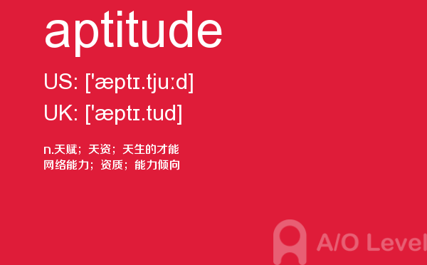 虽然英国a-level院校招生官常把“成绩不是决定录取与否的唯一因素”挂在嘴边,但不得不承认,a-level分数是学生优秀与否的有力证据,取得a-level成绩高分是肯定是优先考虑的。放松一下,先跟着a/o-level考试网来看看今天小编带来的是a-level单词aptitude的介绍。如果您想了解alevel中文口语,alevel社会学,a水准一年,新加坡最好的a水准预科学校等关于a-level考试的相关资讯,请继续浏览并关注课窝a/o-level考试网。