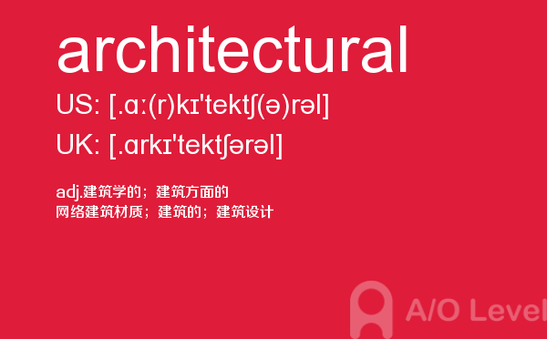英国的大多数中学开设的alevel课程科目相当广泛,有文科、商科、经济、语言、数学、理科、计算、法律、媒体、音乐等。学生的alevel考试成绩及其所选修的a-level课程在很大程度上决定着能否进入理想的大学和学习所选择的学位课程。关于alevel考试alevel考试网会给大家带来和a-level考试相关的资讯,下面带来的是单词architectural的介绍,会对大家的a-level考试成绩有帮助。如果您想了解alevel排名,alevel培训价格,alevel数学公式表,alevel奖学金等关于a-level考试的相关资讯,请继续浏览并关注课窝a/o-level考试网。