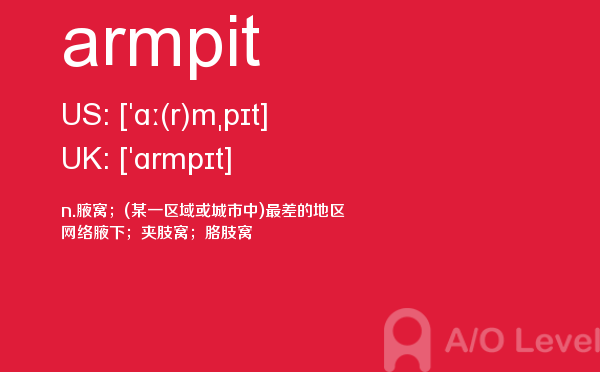 随著学生的素质提升,各大a-level课程培训班的师资和英国a-level题库也不断的完善,近年来学生考出来a-level分数也不断上涨。但是去英国留学,对英国留学资讯和英国的a-level考试资讯都是需要了解的,下面一起跟着a/o-level考试网来看看a-level词汇之armpit的详细介绍。如果您想了解alevel考试费用,a水准一年,alevel英语是什么,新加坡a水准学费等关于a-level考试的相关资讯,请继续浏览并关注课窝a/o-level考试网。