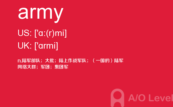 英国留学对于留学成绩的比拼越来越激烈,申请英国院校留学的一大指标a-level考试分数要求也水涨船高.虽然成绩只是申请的一部分,但不得不说,好看的英国a-level成绩是学生是否优秀的证据。放松一下跟着a/o-level考试网来学习一下a-level考试词汇army的应用。如果您想了解alevel夏令营,alevel化学提纲,a水准考试要求,alevel辅导等关于a-level考试的相关资讯,请继续浏览并关注课窝a/o-level考试网。