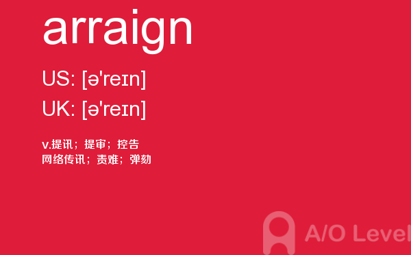 英国高中课程(a-level)的学制为两年:第一年称为as水准,学生通常选择自己最擅长且最有兴趣的3—4门课,通过考试后获得as证书。第二年称为a2水准,学生可选择as水准中优秀的3门课继续学习,通过考试后获得a-level证书。关于a-level学制相信大家肯定有一定的了解,今天alevel考试网想要带大家了解的并不是a-level学制的问题,想要介绍的是a-level重难点单词arraign,希望对大家有帮助。如果您想了解为什么要考alevel课程,上海alevel国际学校,国际学校alevel宣传片,化学alevel2018等关于a-level考试的相关资讯,请继续浏览并关注课窝a/o-level考试网。