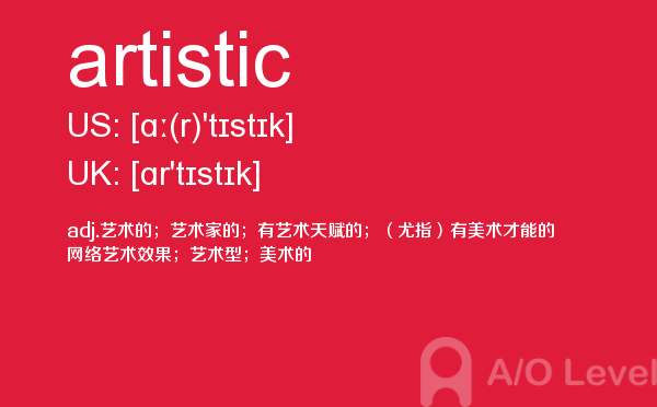 课窝a/o-level考试网上提供了许多信息可以供考生们参考,比如考生需要在此网站报名,打印准考证,或者搜寻与英国a-level考试内容相关的资料等等。考生如果想在短时间内,迅速掌握a-level考试资讯,就需要合理运用此网站的信息。今天带来的是a-level考试词汇之artistic的详细介绍。如果您想了解alevel词汇书,alevel数学内容,alevel物理复习,alevel中文口语考试等关于a-level考试的相关资讯,请继续浏览并关注课窝a/o-level考试网。