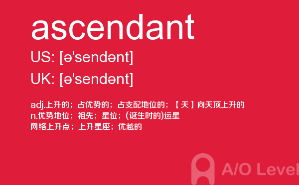 目前,a/olevel逐渐为人所熟知,很多学生都会主动了解alevel考试流程。同时也会抱怨a-level英语题比较难,任务重。那现在我们就放松一下,跟着a/o-level考试网小编来看看a-level考试中要积累的单词ascendant,认真的学习积累。如果您想了解alevel非全日制培训,新加坡a水准好考吗,爱德思alevel中国官网,爱德斯alevel等关于a-level考试的相关资讯,请继续浏览并关注课窝a/o-level考试网。