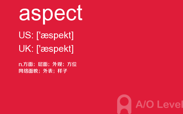 a-level的成绩分为a、b、c、d、e、u六个等级,a为最优,e为通过,u为不及格。如果学生对某门课的成绩不满意,可以选择重考,最终成绩以最好的一次为准。那么a-level考试想要取得a-level高分大家需要做到哪些呢?a/o-level考试网给大家带来的很多a-level考试经验,alevel考试技巧等等,想要考好a-level考试,不仅要知道这些,对于关于a-level考试的所有资讯都需要了解,最重点的是a-level词汇量的积累,今天a/o-level考试网就给大家带来的a-level的考试单词aspect的全面解析。如果您想了解alevel香港中文大学,上海alevel培训班,中国alevel考点,alevel中文书目等关于a-level考试的相关资讯,请继续浏览并关注课窝a/o-level考试网。
