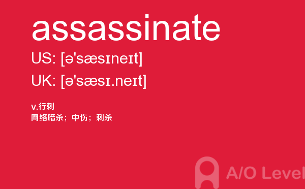 随著学生的素质提升,各大a-level课程培训班的师资和英国a-level题库也不断的完善,近年来学生考出来a-level分数也不断上涨。但是去英国留学,对英国留学资讯和英国的a-level考试资讯都是需要了解的,下面一起跟着a/o-level考试网来看看a-level词汇之assassinate的详细介绍。如果您想了解alevel网校,新加坡alevel考试时间,墨尔本大学alevel,alevel考试局比较等关于a-level考试的相关资讯,请继续浏览并关注课窝a/o-level考试网。