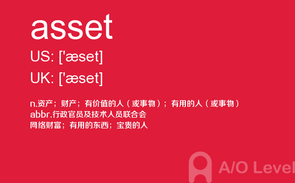 a-level词汇量受到的关注越来越高,很多家长担心a-level考试培训费用,a-level考试录取竞争会不会越来越激烈?这些问题在课窝a/o-level考试网小编都会给大家带来详细介绍,今天a/o-level考试网小编给大家带来的是在a-level考试中的重点词汇asset的详细介绍。如果您想了解alevel学校条件,alevel中文试题,爱德思alevel,英国a水准等关于a-level考试的相关资讯,请继续浏览并关注课窝a/o-level考试网。