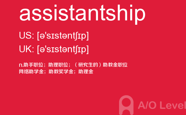 a-level(general certificate of education advanced level ),英国高中课程,是英国全民课程体系,是英国普通中等教育证书考试高级水平课程,也是英国学生的大学入学考试课程。今天alevel考试网小编给大家带来的alevel考试单词assistantship的详细介绍。希望大家能够认真的阅读。如果您想了解中国alevel考点,alevel模考,英国读alevel,alevel考试时间费用等关于a-level考试的相关资讯,请继续浏览并关注课窝a/o-level考试网。