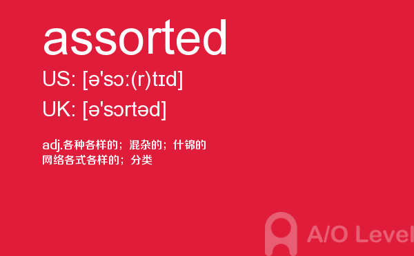 英国a-level学校,从教学质量上来看私立学校更占优势,大部分中国留学生也选择私立学校来读,不过一般都是提前一年来申请学校。中国目前也有20几所a-level学校,每年也同样有走进剑桥牛津等世界顶级大学的学生。所以在国外和在国内都可以选择a-level学校来学习。在前面关于a-level选校的问题已经详细介绍过,那么今天a/o-level考试网小编主要想介绍的是a-level重难点词汇assorted。希望对大家有帮助。如果您想了解alevel证书,爱德思alevel真题,alevel经济2017试卷,新加坡alevel等关于a-level考试的相关资讯,请继续浏览并关注课窝a/o-level考试网。