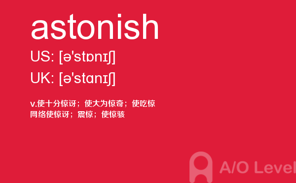 a-level 的考试将由所属的考试委员会分别于每年5-6月和10-11月在全球统一组织,成绩分别在8月和次年2月公布。关于a-level考试时间的具体内容,alevel考试网前面详细介绍过,大家可以查找alevel考试网前面的a-level考试资讯,alevel考试网每天会更新大量的alevel考试资讯,本篇要给大家介绍a-level单词astonish的全面介绍。如果您想了解alevel考试地点,alevel中文,出国留学alevel成绩培训,a水准考试预科班等关于a-level考试的相关资讯,请继续浏览并关注课窝a/o-level考试网。