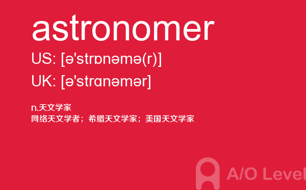 a-level课程适用于年龄在15—18之间,初中毕业以上的在校中学生或具有同等学历的职高生,通常国内a-level学校招收的是高二毕业的学生,并要求参加相关的入学考试,由于a-level课程包括教学及试卷习题等都是英文形式出现,所以这要求学生有较高的英文水平。对于a-level考试适用对象有初步了解之后,下面alevel考试网给大家带来的alevel考试中你需要重点记住的单词astronomer的详细介绍。如果您想了解alevel数学评分,alevel物理考试难度,alevel培训中心,新加坡a水准考试试题等关于a-level考试的相关资讯,请继续浏览并关注课窝a/o-level考试网。
