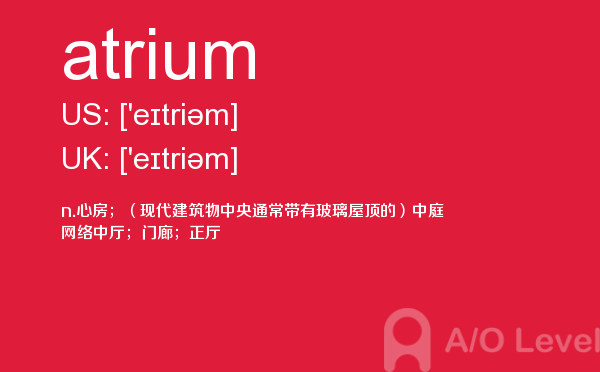 英国a-level学校,从教学质量上来看私立学校更占优势,大部分中国留学生也选择私立学校来读,不过一般都是提前一年来申请学校。中国目前也有20几所a-level学校,每年也同样有走进剑桥牛津等世界顶级大学的学生。所以在国外和在国内都可以选择a-level学校来学习。在前面关于a-level选校的问题已经详细介绍过,那么今天a/o-level考试网小编主要想介绍的是a-level重难点词汇atrium。希望对大家有帮助。如果您想了解alevel官方报名,alevel美术课程,alevel数学难度,alevel高数等关于a-level考试的相关资讯,请继续浏览并关注课窝a/o-level考试网。