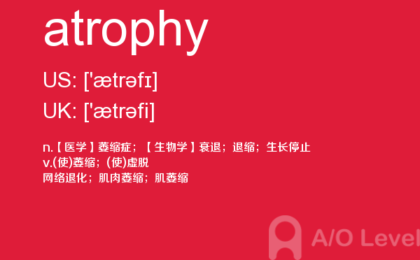 英国a-level学校,从教学质量上来看私立学校更占优势,大部分中国留学生也选择私立学校来读,不过一般都是提前一年来申请学校。中国目前也有20几所a-level学校,每年也同样有走进剑桥牛津等世界顶级大学的学生。所以在国外和在国内都可以选择a-level学校来学习。在前面关于a-level选校的问题已经详细介绍过,那么今天a/o-level考试网小编主要想介绍的是a-level重难点词汇atrophy。希望对大家有帮助。如果您想了解alevel官方报名,alevel美术课程,alevel数学难度,alevel高数等关于a-level考试的相关资讯,请继续浏览并关注课窝a/o-level考试网。