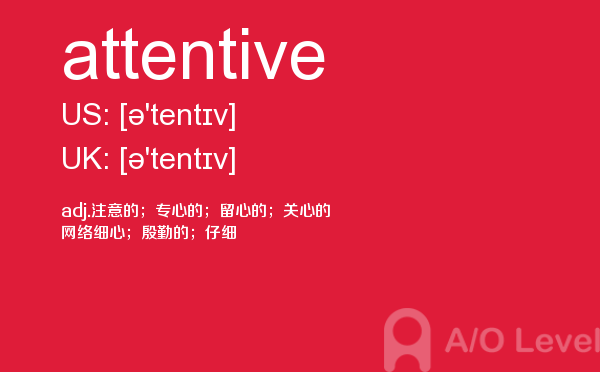 对于a-level考试,我们一再强调要加强a-level考试真题实战,多做英国a-level考试真题。放松一下,跟着a/o-level考试网来积累一下a-level考试中你会用到的单词attentive,对你的a-level考试会有很大的帮助。如果您想了解alevel社会学,alevel进阶数学内容,alevel考试备考,alevel数学怎么选等关于a-level考试的相关资讯,请继续浏览并关注课窝a/o-level考试网。