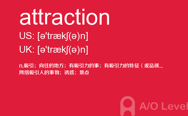 a-level课程包含70多门供学生选择,一般学生选择3至4门来学,中国学生在数学学科上有很大的优势,一般学生都会选择基础数学。学生选择课程时,一般要考虑现在自己的优势科目和将来的发展方向,即你想选择哪个大学、什么专业,从而根据他们的要求有的放矢地选课。关于alevel选课后续会详细介绍,下面带来a-level考试词汇attraction的详细介绍。如果您想了解alevel社会学,alevel考试满分,alevel真题下载,新加坡a水准预科等关于a-level考试的相关资讯,请继续浏览并关注课窝a/o-level考试网。