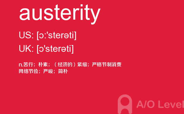 虽然英国a-level院校招生官常把“成绩不是决定录取与否的唯一因素”挂在嘴边,但不得不承认,a-level分数是学生优秀与否的有力证据,取得a-level成绩高分是肯定是优先考虑的。放松一下,先跟着a/o-level考试网来看看今天小编带来的是a-level单词austerity的介绍。如果您想了解alevel考试在中国,alevel物理分数线,alevel数学真题下载,alevel学校等关于a-level考试的相关资讯,请继续浏览并关注课窝a/o-level考试网。