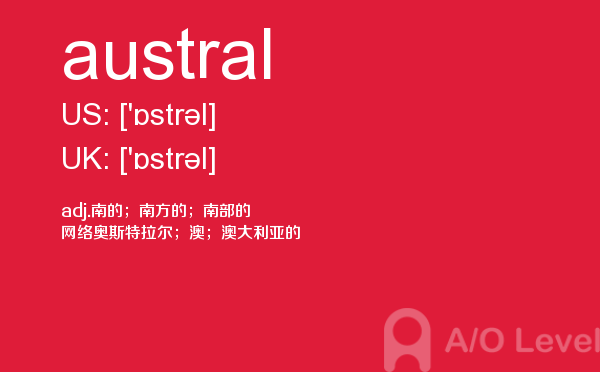 英国a-level入学考试的机会真的很少,每年就5-6月和10-11月两场考试。所以千万别因为不必要的原因,影响了a-level入学考试。为了让大家更好的在英国留学,a/o-level考试网会为大家带来a-level考试相关的资讯,一起来看看a/o-level考试网今天带来的词汇austral的解析。如果您想了解新加坡大学alevel,新加坡a水准考试试题,上海alevel中心,alevel考试时间费用等关于a-level考试的相关资讯,请继续浏览并关注课窝a/o-level考试网。