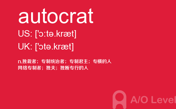 英国高中课程(a-level)的学制为两年:第一年称为as水准,学生通常选择自己最擅长且最有兴趣的3—4门课,通过考试后获得as证书。第二年称为a2水准,学生可选择as水准中优秀的3门课继续学习,通过考试后获得a-level证书。关于a-level学制相信大家肯定有一定的了解,今天alevel考试网想要带大家了解的并不是a-level学制的问题,想要介绍的是a-level重难点单词autocrat,希望对大家有帮助。如果您想了解经济学alevel拿a难不难,国内知名alevel培训,alevel课程教案,国际学校如何考alevel等关于a-level考试的相关资讯,请继续浏览并关注课窝a/o-level考试网。