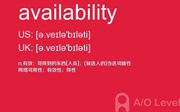 英国、加拿大、爱尔兰、澳大利亚、新西兰、新加坡等英语国家没有统一的大学入学标准,虽然它们都认可a-level证书,但是各所大学、各个专业对学生学过哪几门a-level课程以及成绩都有不同的要求。所以怎样选择课程并没有一个唯一的答案。对于如何选课的问题要根据具体情况而定。这些在你的a-level考试中都不是重要的,重要的是a-level成绩,a-level成绩取决于a-level词汇量,那么今天小编给大家带来a-level考试重点词汇availability的全面解析。如果您想了解alevel是什么,alevel面试,alevel去哪考试在中国,alevel成绩等关于a-level考试的相关资讯,请继续浏览并关注课窝a/o-level考试网。