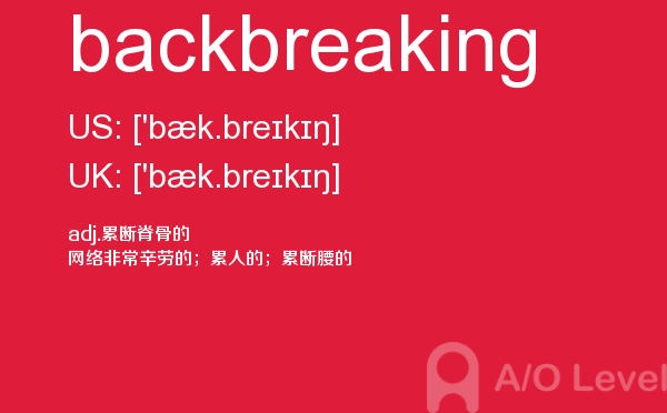 随着英国留学申请竞争的白热化,a-level成绩在学生个人简历中扮演的“入场券”角色,变得越来越重要。然而,在你参加a-level考试培训班前,你首先要对a-level考试有着一定的了解,一起跟着a/o-level考试网来看看小编今天带来a-level单词backbreaking的详细介绍。如果您想了解alevel考试机经,alevel真题试卷,alevel都有什么课程,alevel课程多久等关于a-level考试的相关资讯,请继续浏览并关注课窝a/o-level考试网。