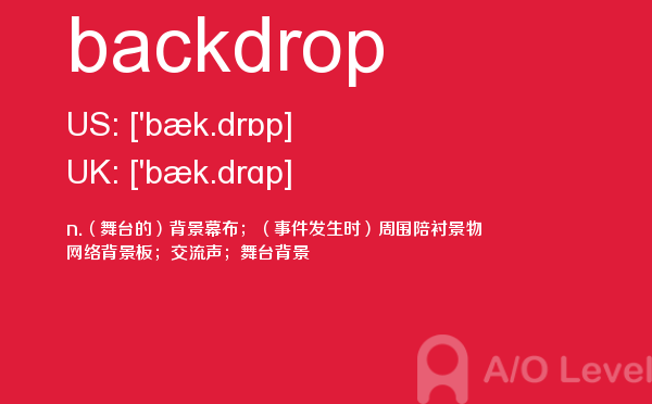 a-level课程适用于年龄在15—18之间,初中毕业以上的在校中学生或具有同等学历的职高生,通常国内a-level学校招收的是高二毕业的学生,并要求参加相关的入学考试,由于a-level课程包括教学及试卷习题等都是英文形式出现,所以这要求学生有较高的英文水平。对于a-level考试适用对象有初步了解之后,下面alevel考试网给大家带来的alevel考试中你需要重点记住的单词backdrop的详细介绍。如果您想了解alevel官方考试局,考alevel多少钱,bc和alevel哪个好,alevel香港中文大学等关于a-level考试的相关资讯,请继续浏览并关注课窝a/o-level考试网。