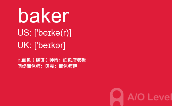 英国a-level学校,从教学质量上来看私立学校更占优势,大部分中国留学生也选择私立学校来读,不过一般都是提前一年来申请学校。中国目前也有20几所a-level学校,每年也同样有走进剑桥牛津等世界顶级大学的学生。所以在国外和在国内都可以选择a-level学校来学习。在前面关于a-level选校的问题已经详细介绍过,那么今天a/o-level考试网小编主要想介绍的是a-level重难点词汇baker。希望对大家有帮助。如果您想了解alevel数学,alevel历年成绩分析,alevel物理知识,南京a水准培训等关于a-level考试的相关资讯,请继续浏览并关注课窝a/o-level考试网。