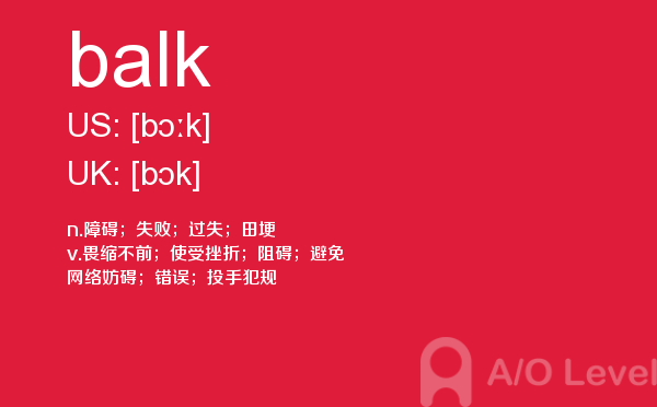 随著学生的素质提升,各大a-level课程培训班的师资和英国a-level题库也不断的完善,近年来学生考出来a-level分数也不断上涨。但是去英国留学,对英国留学资讯和英国的a-level考试资讯都是需要了解的,下面一起跟着a/o-level考试网来看看a-level词汇之balk的详细介绍。如果您想了解alevel怎么自学,a水准数学,alevel考试指南,alevel自学选什么等关于a-level考试的相关资讯,请继续浏览并关注课窝a/o-level考试网。