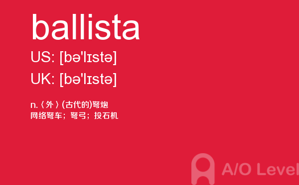 a- level课程一般在中国开设数学、进阶数学(或称高等数学)、物理、计算机学、会计学、商业学、经济学等课程供学生选择。那么关于alevel考生应该选哪些alevel课程呢?以后会给大家详细介绍,今天a/o-level考试网主要给大家全面介绍a-level词汇中的ballista单词。如果您想了解新加坡alevel课程,港大alevel申请条件,alevel报名费用,alevel课程的劣势等关于a-level考试的相关资讯,请继续浏览并关注课窝a/o-level考试网。