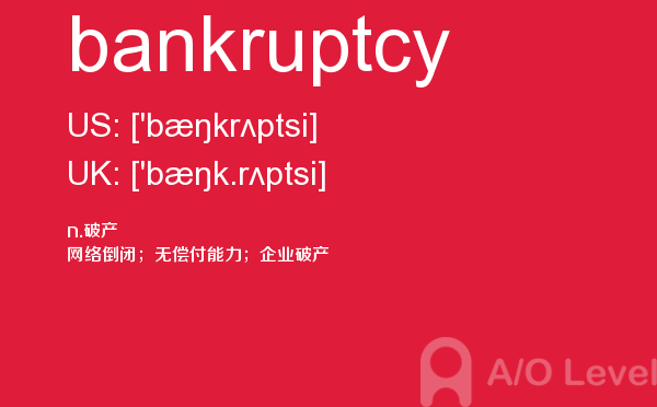 a-level的成绩分为a、b、c、d、e、u六个等级,a为最优,e为通过,u为不及格。如果学生对某门课的成绩不满意,可以选择重考,最终成绩以最好的一次为准。那么a-level考试想要取得a-level高分大家需要做到哪些呢?a/o-level考试网给大家带来的很多a-level考试经验,alevel考试技巧等等,想要考好a-level考试,不仅要知道这些,对于关于a-level考试的所有资讯都需要了解,最重点的是a-level词汇量的积累,今天a/o-level考试网就给大家带来的a-level的考试单词bankruptcy的全面解析。如果您想了解alevel化学提纲,alevel经济学问题,alevel真题试卷,怎么去英国读alevel课程等关于a-level考试的相关资讯,请继续浏览并关注课窝a/o-level考试网。