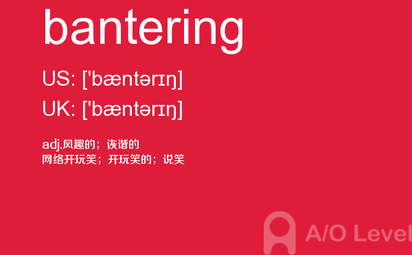 英国的大多数中学开设的alevel课程科目相当广泛,有文科、商科、经济、语言、数学、理科、计算、法律、媒体、音乐等。学生的alevel考试成绩及其所选修的a-level课程在很大程度上决定着能否进入理想的大学和学习所选择的学位课程。关于alevel考试alevel考试网会给大家带来和a-level考试相关的资讯,下面带来的是单词bantering的介绍,会对大家的a-level考试成绩有帮助。如果您想了解alevel考试报名,a水准h1和h2,alevel高中,alevel参考书等关于a-level考试的相关资讯,请继续浏览并关注课窝a/o-level考试网。