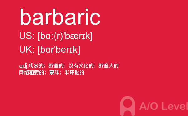 在a-level备考的过程中,想要冲刺到a-level写作的高分,相信大家都应该会知道,除了需要掌握a-level写作的一些技巧之外,优化文章中的词汇和句型也是冲刺高分的关键所在。也就是说,只有充分掌握了语法知识,才能让我们的的文章更为丰富形象。除了a-level写作,在a-level其他方面同学们也需要了解,下面课窝a/o-level考试网小编给大家带来a-level单词barbaric的介绍。如果您想了解alevel考试的考生年龄上限是多少,alevel国际学校,alevel剑桥,alevel物理讲义等关于a-level考试的相关资讯,请继续浏览并关注课窝a/o-level考试网。