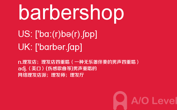 现在很多人来咨询a-level考试录取率,英国a-level考试题库的家长也依然不减,而考生们则更关心a-level教材以及a-level考试培训课程是什么样的。a/o-level考试网都会解答您。今天小编带来a/o-level考试网的内容是关于a-level词汇的barbershop单词的详细介绍。如果您想了解牛津大学alevel,上海alevel国际学校,alevel数学评分标准,alevel考试大纲等关于a-level考试的相关资讯,请继续浏览并关注课窝a/o-level考试网。